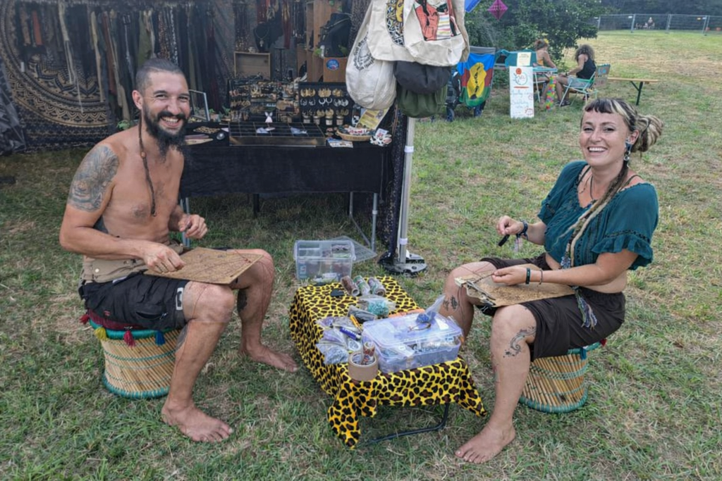 Delpeixo, c’est Amandine et Peix : un couple de voyageurs, passionnés autant par les univers alternatifs que par les liens humains tissés au fil de chaque événement.